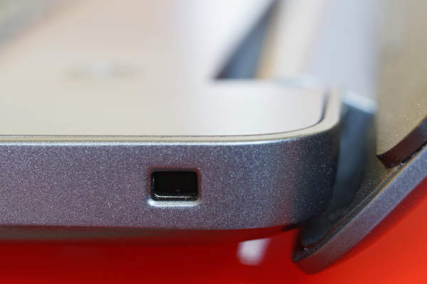 Typically on the side or front base of the laptop, this little port is called a Kensington Security Slot. It’s designed to work with a Kensington Lock/Cable to physically secure the device to an anchor point.